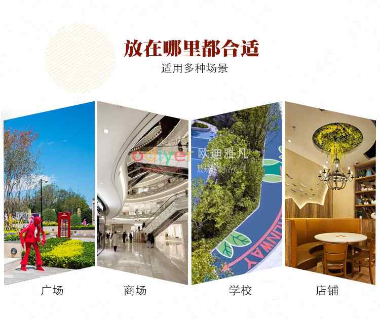 玻璃钢雕塑的应用范围决定了玻璃钢雕塑的价格,如果是用在商场、室内公共区域价格相对会低一些,用于室外的玻璃钢雕塑要求会高一些,价格也会相对高一些。